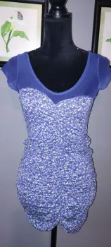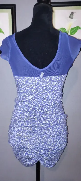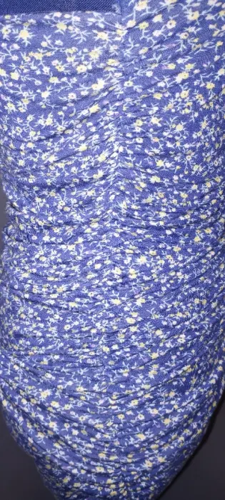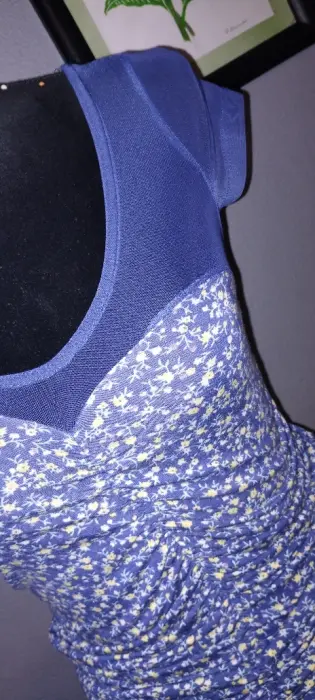 Bonito vestido floreadoBonito detalle de drapeado al frente y laterales.También con detalle de Spandex transparente azul en escote y manga.