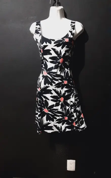 Vestido floreado. Vestido corto con diseño floreado con negro blanco y rosado escote redondo con Varillas en la parte del torso
