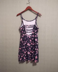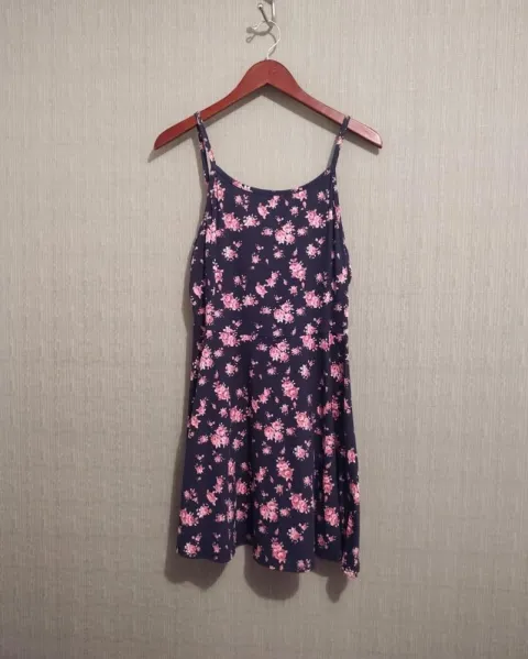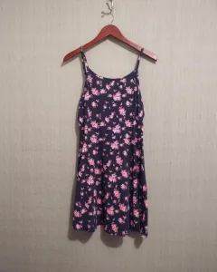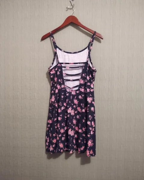 Vestido azul con flores rosas. Tirantes y escote en la espalda, con ligero vuelo en la parte de la falda