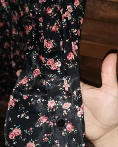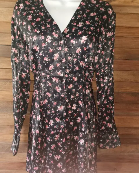 Vestido floreado. Lindo vestido tipo seda, espalda completamente cerrada tiene botones enfrente para abrocharse.Tiene apliques en los costados que marcan la figura.