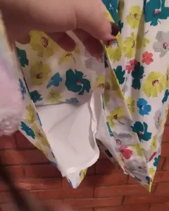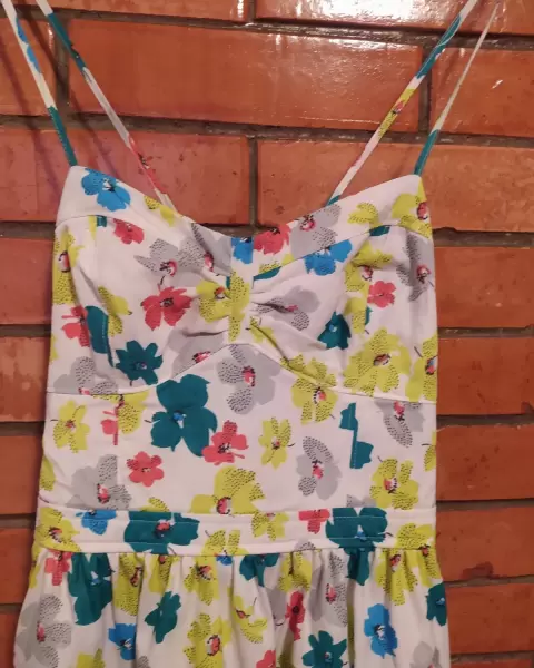Lindísimo vestido floreado, con tirantes cruzados y elástico en la espalda, con forro, sin ningún detalle. Muchas gracias y muy bonito día a todas!! 😉