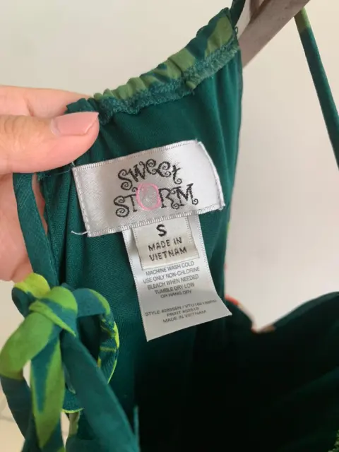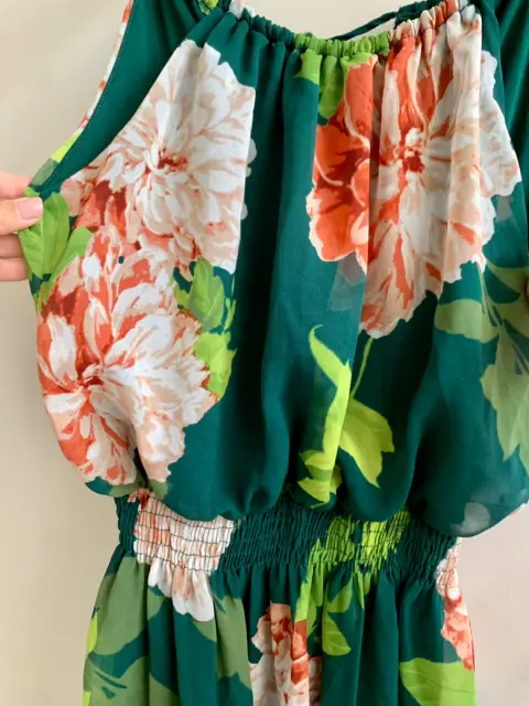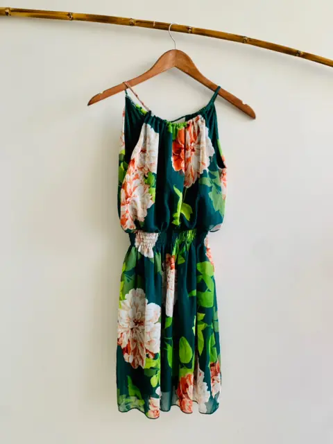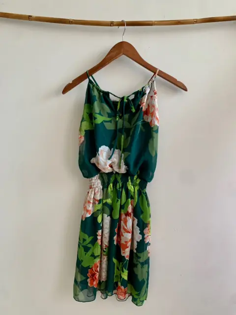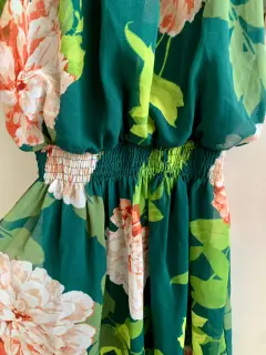 Vestido floreado color verde, es talla chica, es corto, tiene elástico y dos listones en la parte de atrás. 🙌🏻