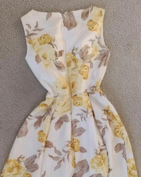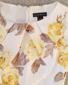 Vestido floreado elegante. Divino, anexo foto de cómo se ve puesto queda debajo de la rodilla dice talla m pero sea ajusto para que quedara a talla sIdeal para bautizo y una boda de díaAquí no aparece la marca pero se compró en Macy's