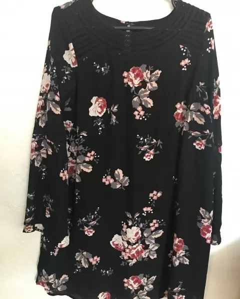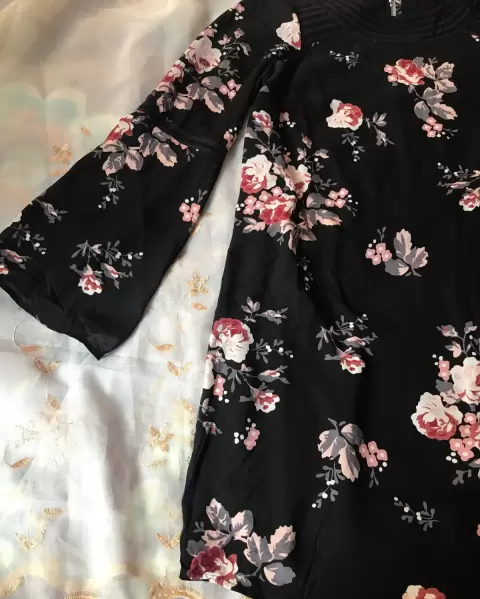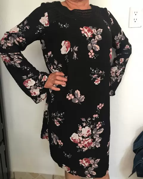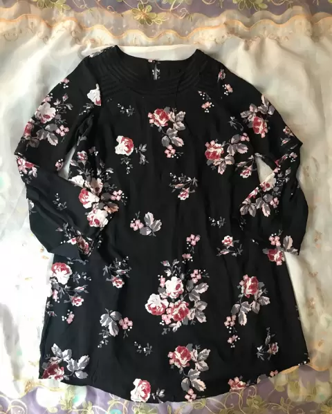 Vestido floreado, cuello redondo, manga larga en forma de campana, no tiene talla pero queda bien S-M (tela no estira), axila axila 48cm, hombro hombro 42cm, cintura 54cm, largo 90cm,