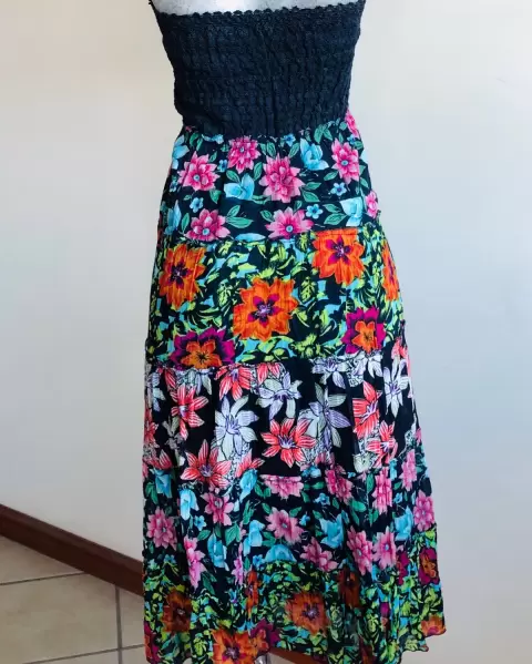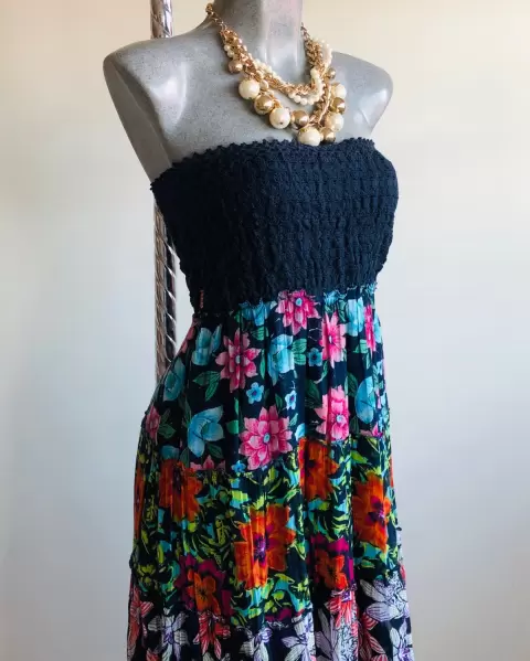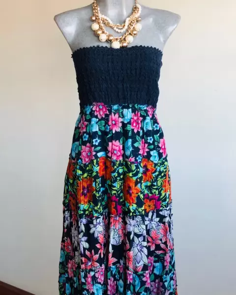 VESTIDO FLOREADO STRAPLESS. HERMOSO VESTIDO AZUL MARINO Y ESTAMPADO FLOREADO STRAPLESS PARTE SUPERIOR ELÁSTICA, TALLA CHICA, MARCA RAVIYA. ENVÍO LA PRENDA SANITIZADA, USO MATERIAL RECICLADO GRACIAS POR TU COMPRENSIÓN 😊