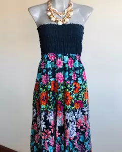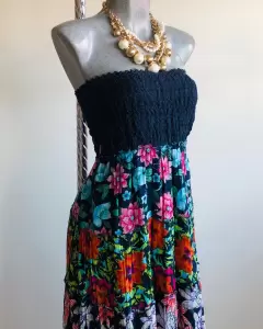 HERMOSO VESTIDO AZUL MARINO Y ESTAMPADO FLOREADO STRAPLESS PARTE SUPERIOR ELÁSTICA, TALLA CHICA, MARCA RAVIYA. ENVÍO LA PRENDA SANITIZADA, USO MATERIAL RECICLADO GRACIAS POR TU COMPRENSIÓN 😊