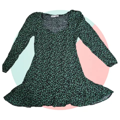 Vestido floreado verde con negro. Vestido casual Flores verdes fondo negro! 🍀☘️La tela es un poco elastica, tiene cierre a un lado muy lindo! Marca: Zara Talla: L (mex 30)