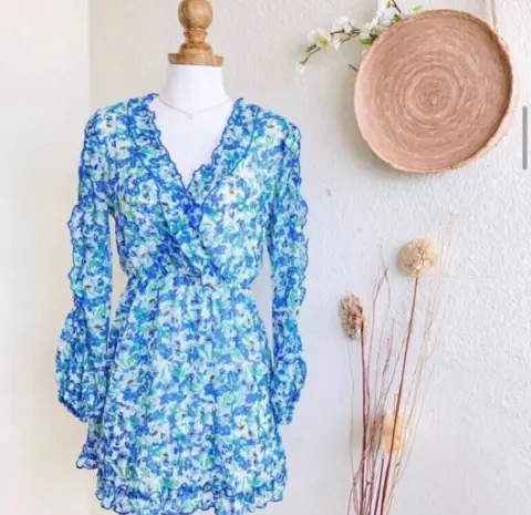 Vestido precioso, manga larga 🥰 con flores , escote en VNUEVO StradivariusTalla MPecho 49-55cm cintura 32-50cm largo 90 cm