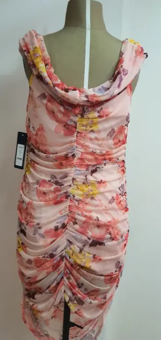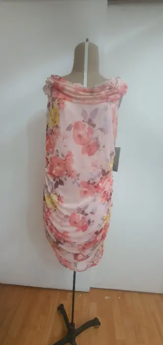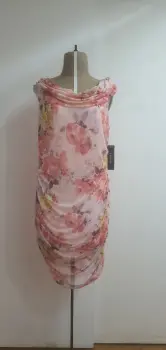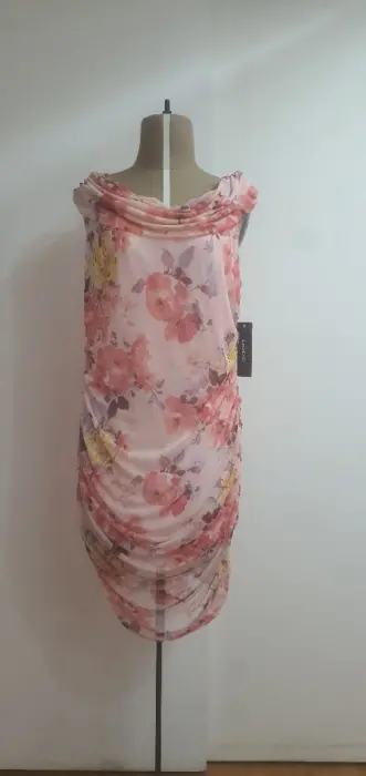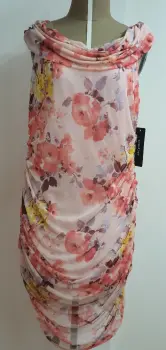 Vestido flores rosa. Vestido drapeado, sin mangas con escote de columpio, costados drapeados, es hermoso y elegante.