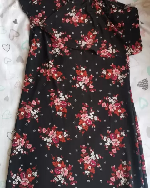 Vestido Shasa negro floral NUEVO talla chico, es de una sola manga con un olán, de tela muy fresca y elástica que se amolda perfecto al cuerpo. Mide de largo aproximadamente 86 cm