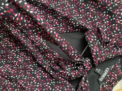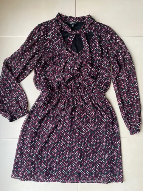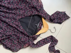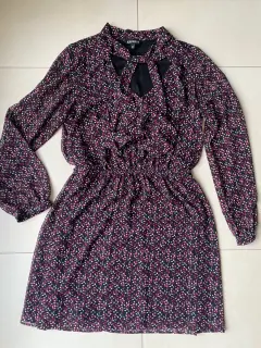 Hermoso vestido corto de manga larga , es negro con estampado en tonos guinda, tiene la cintura marcada con resorte y dos tiras en el cuello V para hacer un moño