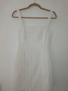 Vestido blanco con bordados de líneas con coloresSin detalles en perfecto estadoMedidas axila - axila 41cm, Largo total 65cm, cintura 35cm70% algodón30% rayónFondo 80%poliester y 20%algodon**