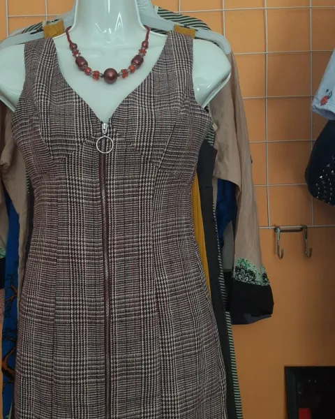Diseño a cuadros, cierre al frente en todo el vestido, con tirantes, se puede usar con una playera abajo.
