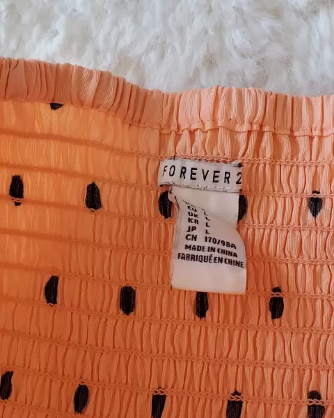 Vestido forever neón. Hermoso vestido color melón y bolitas negras Straple. Con silicon para un mejor ajuste. .elastica en la espalda