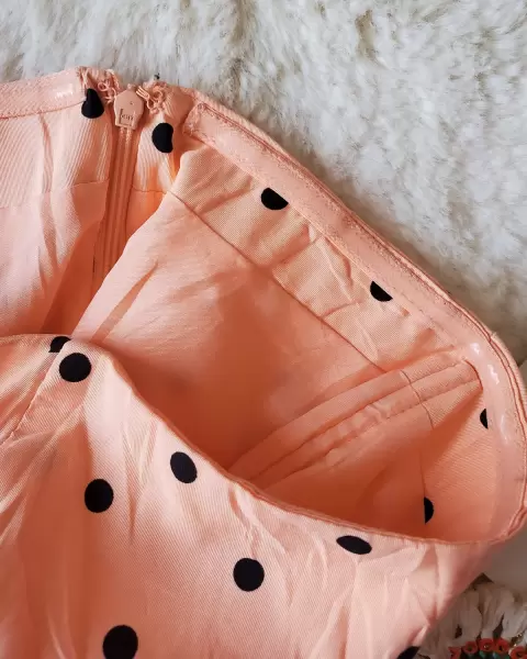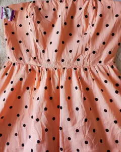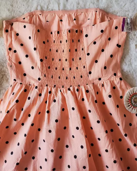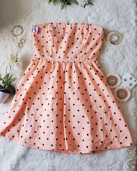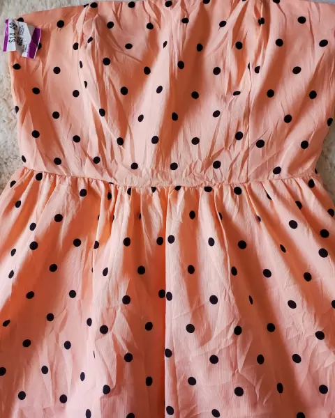 Hermoso vestido color melón y bolitas negras Straple. Con silicon para un mejor ajuste. .elastica en la espalda