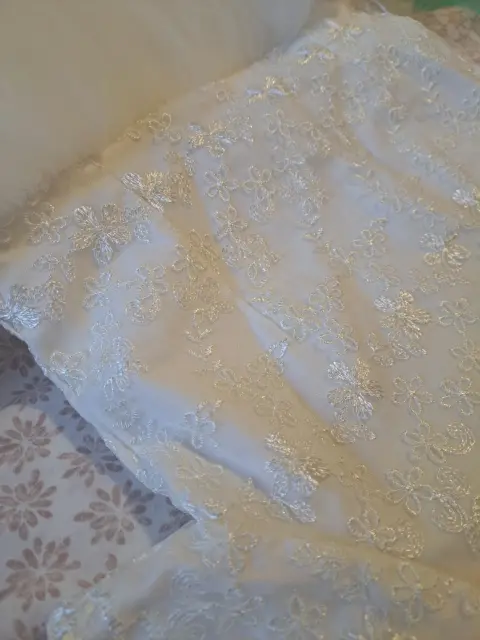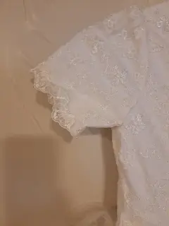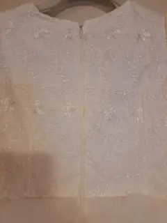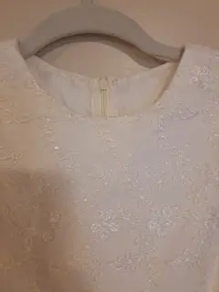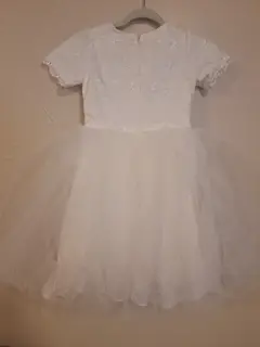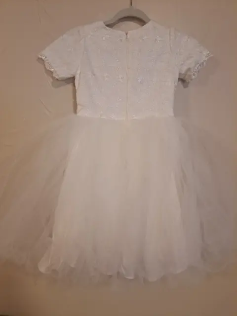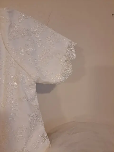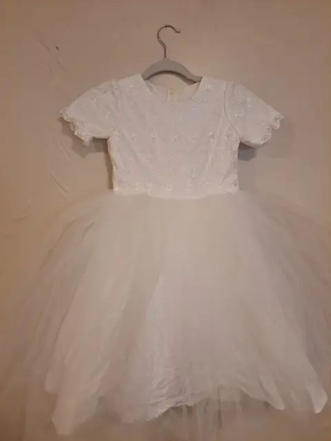 Vestido formal Tul con encaje en la parte arriba.Talla 5-6Colo beige casi blancosin marca fue mandado a hacer.Busto 34.5cmCintura 32cmTalle 30.5cmAnchi manga 13 cmLargo 76cm5Trae dos capas de tul, la tela de abajo es suave y no pica.