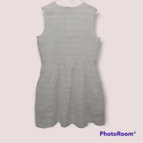 Vestido GAP Designed & crafted t 12 color blanco nieve diseño en tela lineas horizontaes sisado cuello redondo cierre trasero con broche de gancho bolsas ocultas laterales forro completo material tela y forro 100% algodón. 50cm de axila a axila 20cm profundidad de sisa 89cm largo