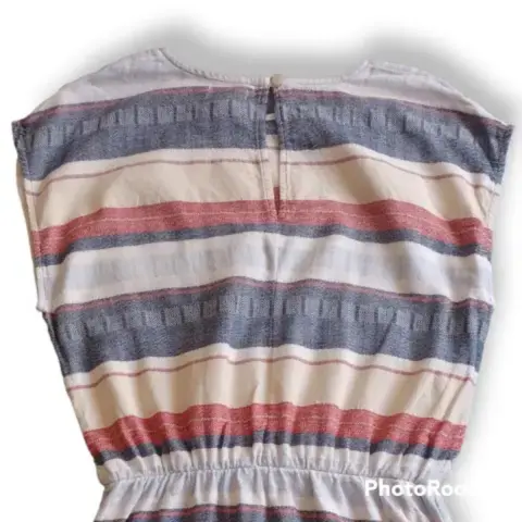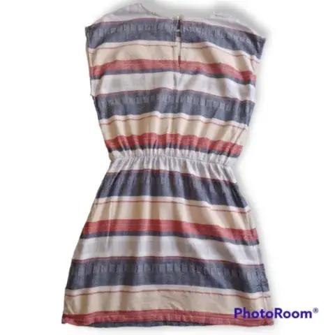 Vestido GAP t M americano colores en linea horizontal azul beige rojo gris azul cielo resorte en cintura 100% algodón cuello redondo botón trasero 53cm axila a axila 92cm largo aproximadamente tela ligera y fresca.