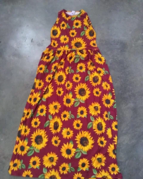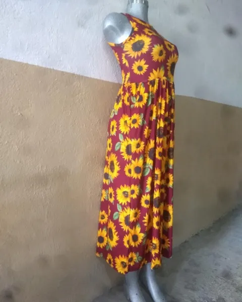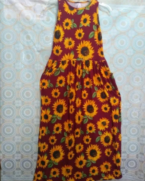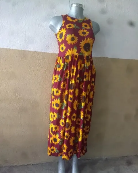 Vestido girasoles. Hermoso vestido de girasoles color vino, sin manga con resorte en la cintura y bolsas a los lados tela fresca y cómoda muy estirable.