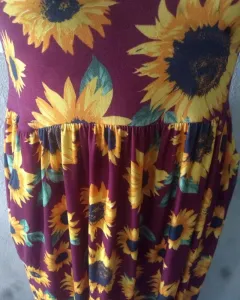 Hermoso vestido de girasoles color vino, sin manga con resorte en la cintura y bolsas a los lados tela fresca y cómoda muy estirable.