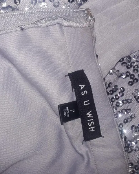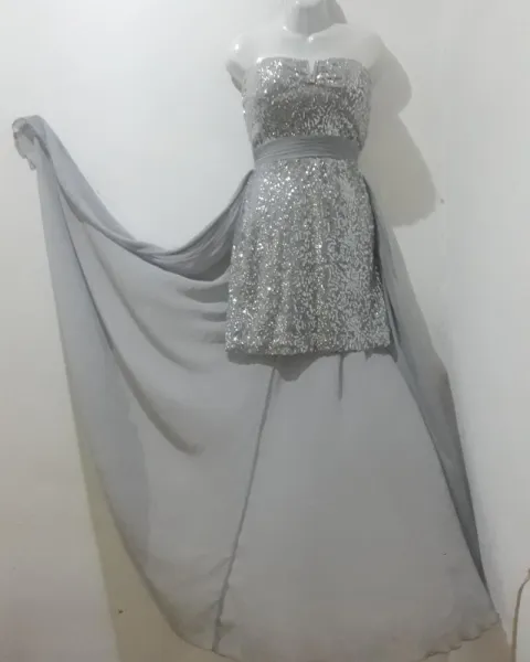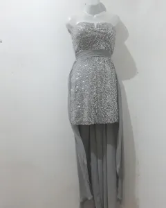 Vestido gris cola de pato. Vestido de fiesta color gris se ajusta al cuerpo, con cola, talla 7.