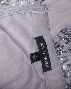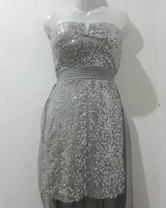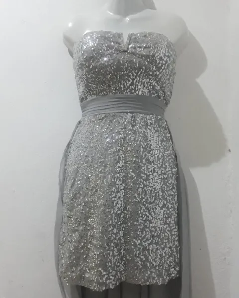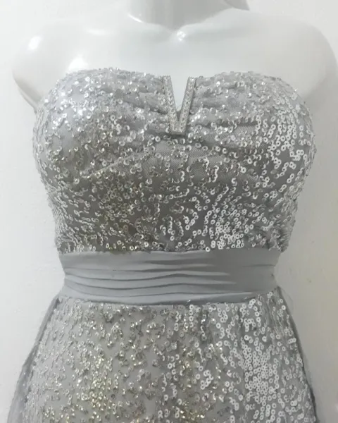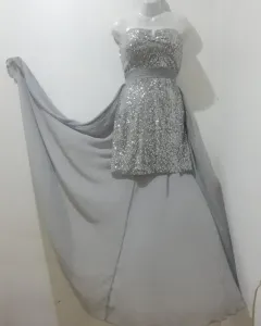 Vestido de fiesta color gris se ajusta al cuerpo, con cola, talla 7.