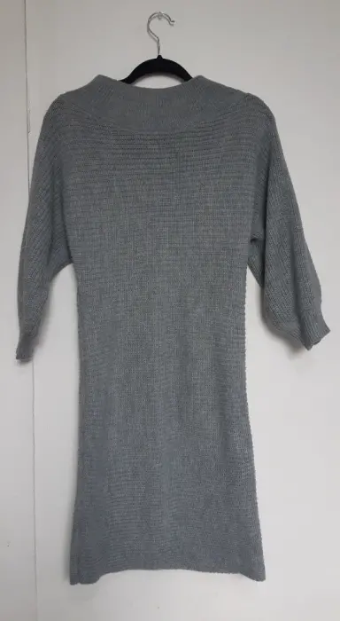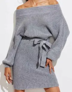 Vestido de punto en color gris, es descubierto en los hombros y cuenta con cinturon. Es IDÉNTICO AL DE LA PRIMERA FOTO. Es NUEVO. Esta padrísimo.