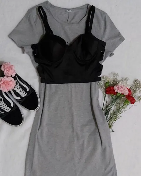 Vestido gris pegado. La tela no transparenta, es licra resistente y amolda bonito al cuerpo, llega abajo de la rodilla, sin detalles