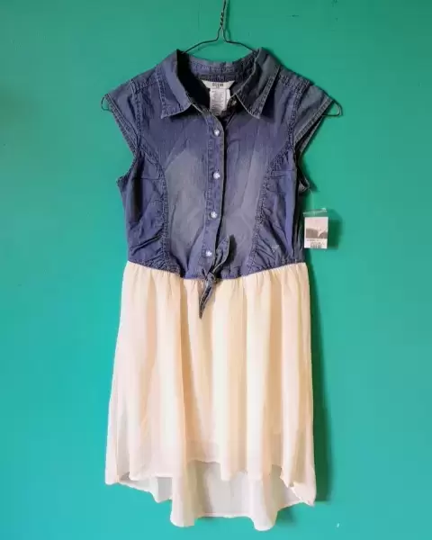 Lindo vestido de niña, simula 2 piezas, parte de arriba mezclilla deslavadad, botones de piedrita. Es talla 14 pero viene reducida del talle.