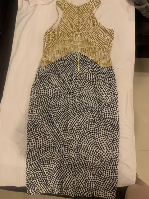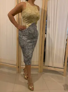 Vestido H&M multicolor amarillo, azul y beige, tipo halter con cierre en la espalda, tela strech talla M pero estira hasta una L, no se transparenta, fresco y cómodo!