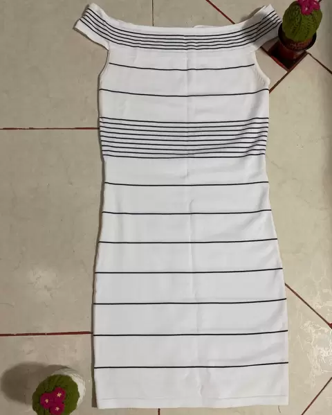 Vestido hombros descubiertos. Vestido corto, pegado con hombros descubiertos, tela gruesa