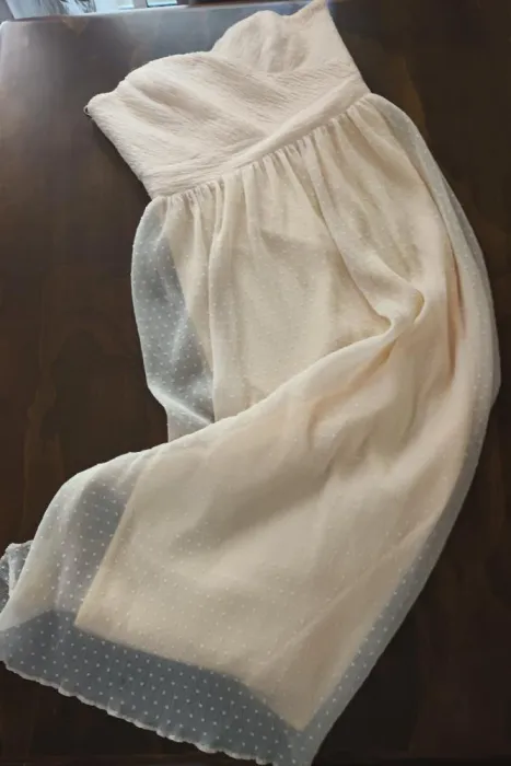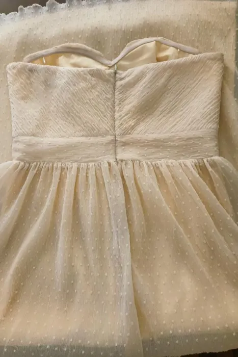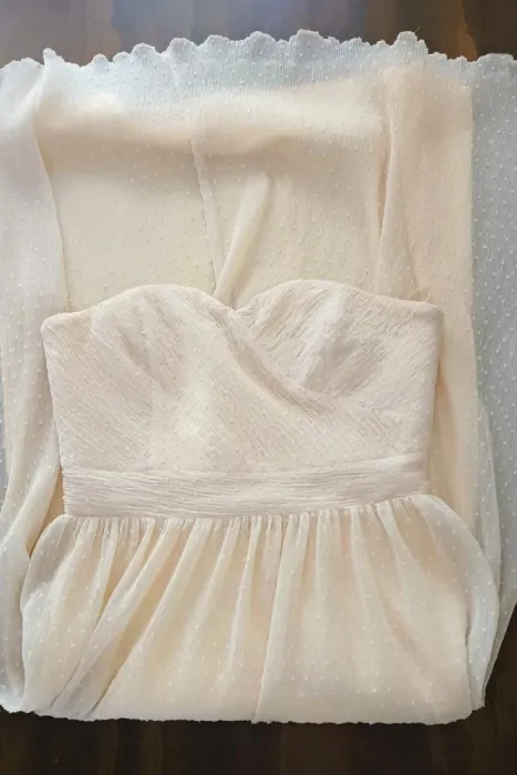 Vestido strapless, largo, color hueso, tela texturizada, forro y cierre en la espalda.