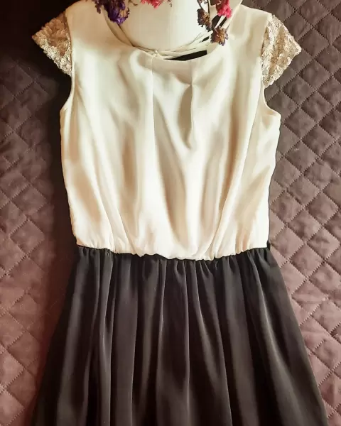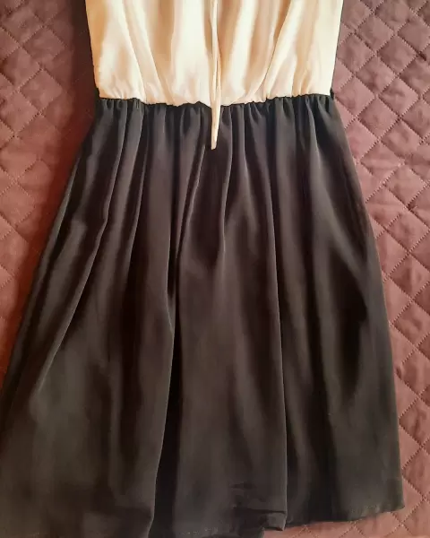 Vestido hueso y negro. Vestido ligero, color beige y negro, la tela es suave. En las mangas tiene detalles lentejuela color crema muy lindas, en la parte de atrás abierto en V. Suelto, ligeramente arriba de la rodilla. Excelente condiciones