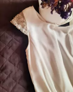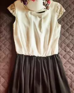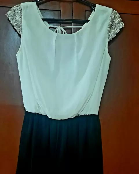 Vestido ligero, color beige y negro, la tela es suave. En las mangas tiene detalles lentejuela color crema muy lindas, en la parte de atrás abierto en V. Suelto, ligeramente arriba de la rodilla. Excelente condiciones