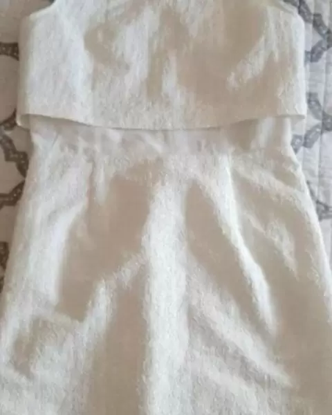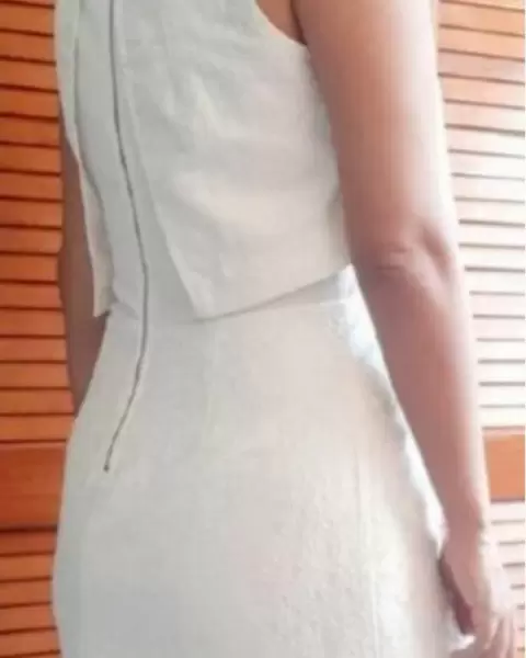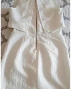 Elegante vestido con un corte único que acuerpa muy bonito. Da el efecto blusa top más falda pero es una sola pieza. Cierre en la parte trasera funcionando perfecto. No trae forro pero no es necesario porque no se transparenta. Largo 48 cms, Cintura 40, Pecho 46 cms de axila a axila, brazo 24 cms. Talla M. Es color perla