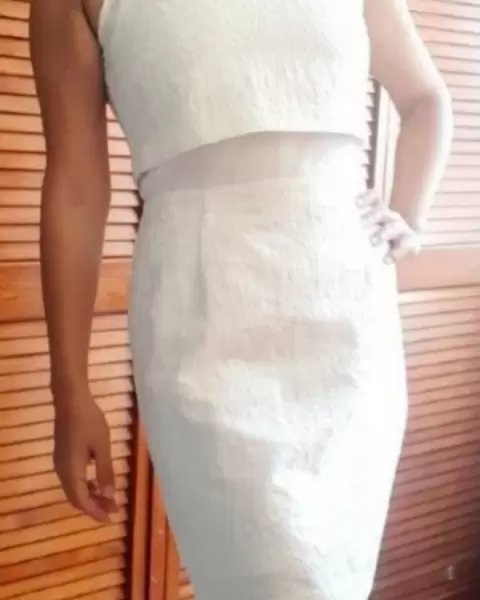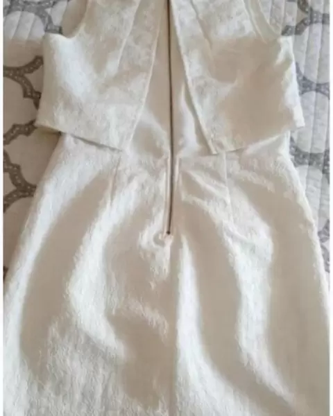 Vestido ideal para boda civil, bautizo, etc. Elegante vestido con un corte único que acuerpa muy bonito. Da el efecto blusa top más falda pero es una sola pieza. Cierre en la parte trasera funcionando perfecto. No trae forro pero no es necesario porque no se transparenta. Largo 48 cms, Cintura 40, Pecho 46 cms de axila a axila, brazo 24 cms. Talla M. Es color perla