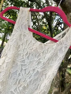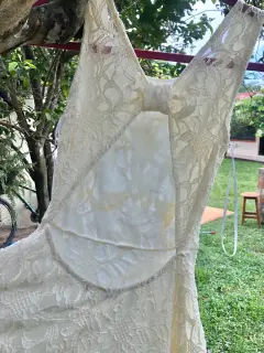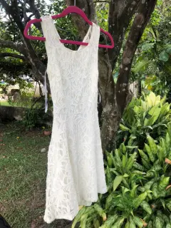 Vestido corto tono ivory de encaje , tela elástica , la abertura de la espalda tipo moño es súper linda .
