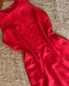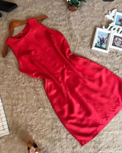 No le puedes decir que no a este bello vestido color rojo cereza, son mangas es elegante y formal me costó 1800 en tienda talla M, ideal para usar con un Blazer encima.Pecho 48cmCintura 47cmLargo 93cm