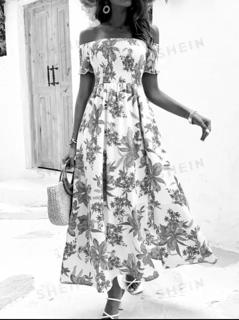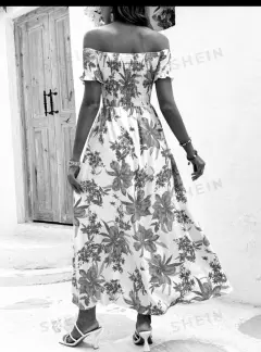 Vestido largo. SHEIN Holidaya Vestido De Mujer Con Estampado De Plantas, Manga Corta Y Hombros Descubiertos
