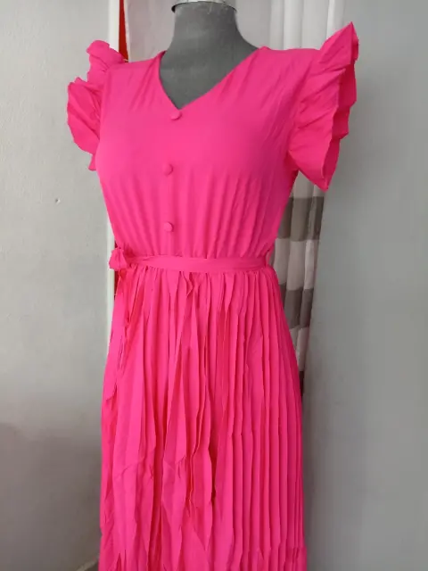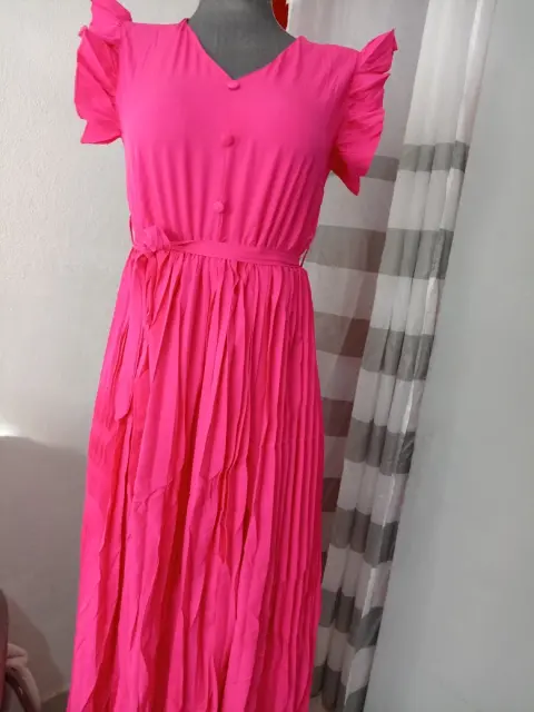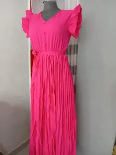 Bonito vestido largo con falda tableadaColor FucciaUnitalla queda bien a talla M