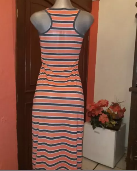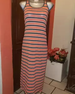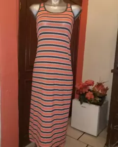Vestido largo a rayas, multicolor, tirantes, y por detrás con resaque, axila 40cm, cintura 38cm, largo 123cm.