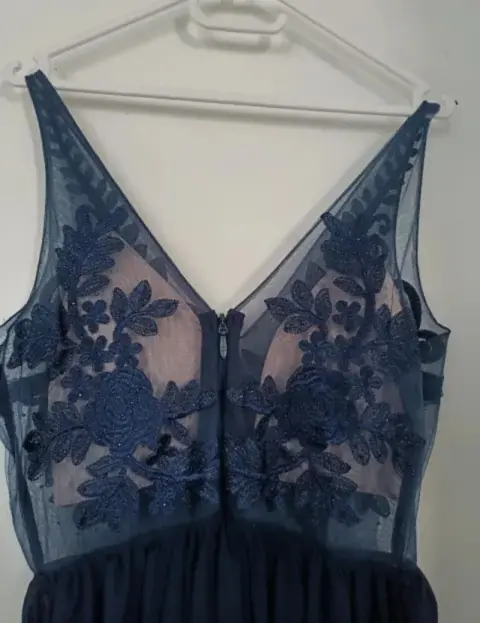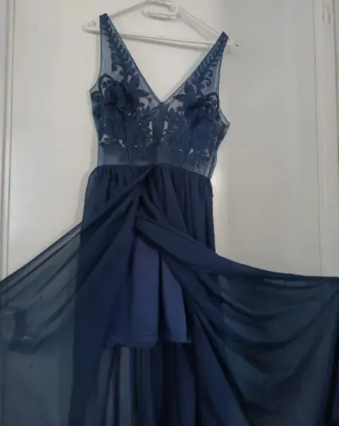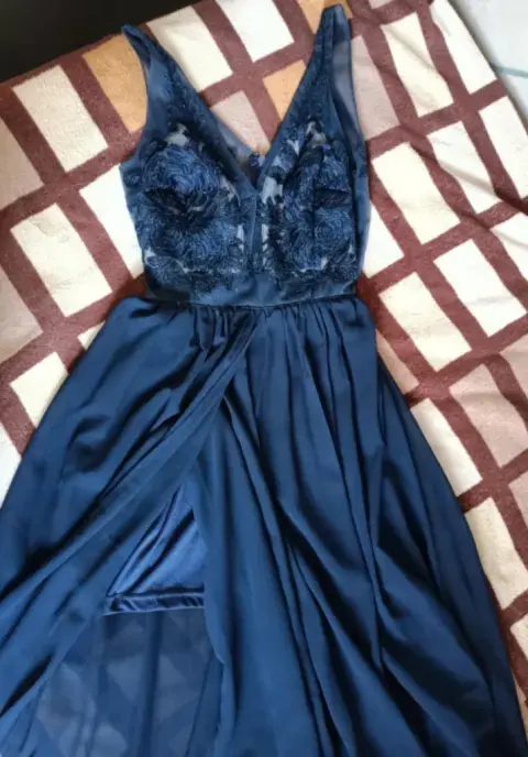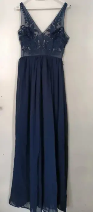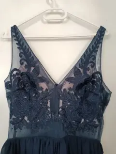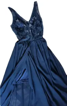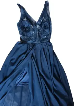Vestido de boutique, largo azul marino, con el fondo corto y la tela superior larga, con abertura en la pierna. Detalles de encaje en la parte de la blusa, con sostén incluido. En excelentes condiciones.