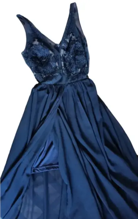 Vestido largo azul elegante. Vestido de boutique, largo azul marino, con el fondo corto y la tela superior larga, con abertura en la pierna. Detalles de encaje en la parte de la blusa, con sostén incluido. En excelentes condiciones.