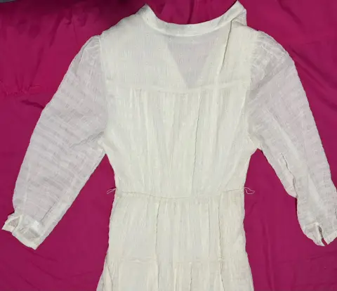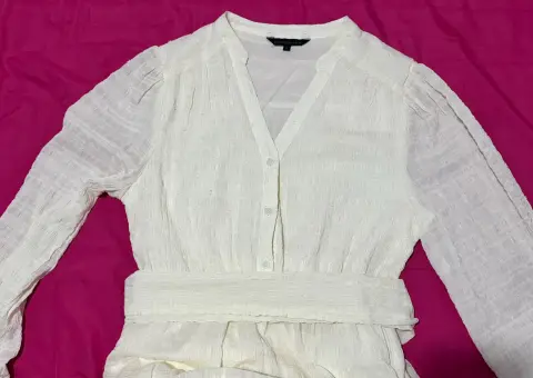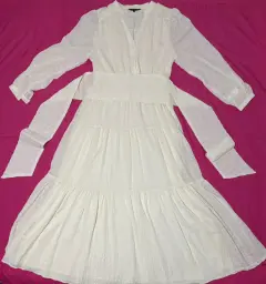 Vestido largo, manga larga, color beige, cinturón misma tela, botones al frente, talla G, marca Chester & Peck