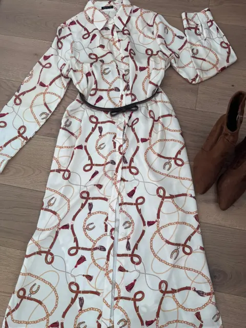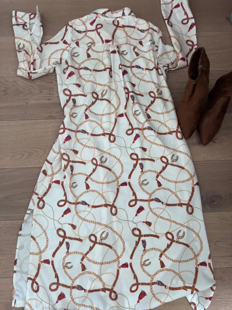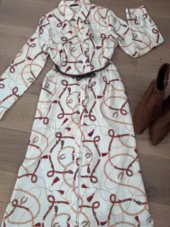 Hermoso vestido que se puede usar con botas, botines o zapatillas. Puede ser un outfits con jeans como blusón, su corte recto te da para crear diferentes combinaciones. Tiene pequeñas manchas de la misma tela como se muestra en la última foto pero no impide su uso.Medidas:hombro 39 cmCintura 57 cmAxila a axila 63 cmLargo 117 cm
