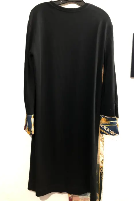 Vestido largo con vivos de colores. VESTIDO NEGRO CON VIVOSVestido negro recto, puños en tela de cadenas. Simula de mascada al frenteCuello redondo. preciosoTipo de tela tejido cerrado, estira la telaMEDIDASLargo 1.25cmhombro 39-40cmpecho 98cm