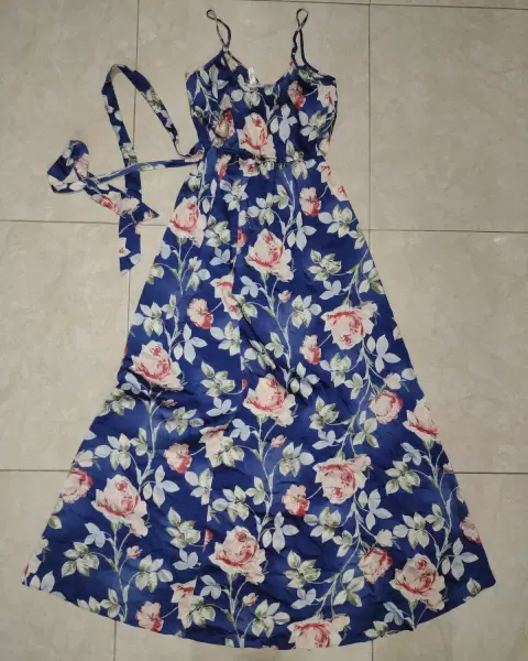 Vestido largo corte irregular estampado. Azul marino con estampado de flores blancas y beige