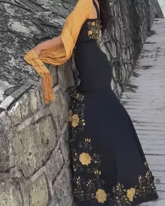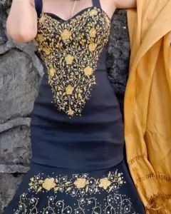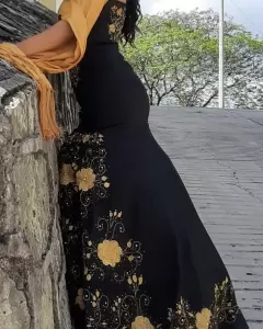 Vestido largo corte sirena. Vestido corte sirena, con bordado en hilo color dorado y pedrería, la tela estira, incluye reboso y crinolina.
