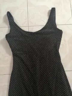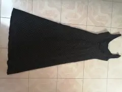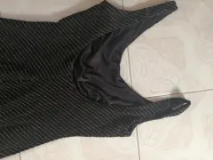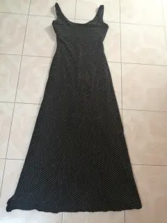 Vestido largo en color negro con cintillas plata, escote, tela con elastano, ajusta muy bien al cuerpo. Sencillo pero elegante.