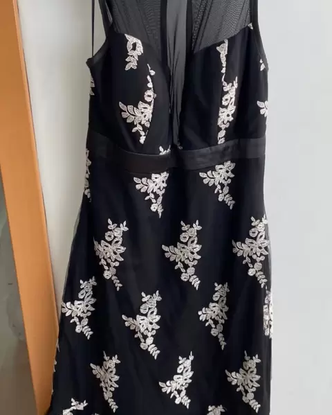 Vestido largo de fiesta negro. Transparencias en la parte de arriba, talla 6, excelente estado